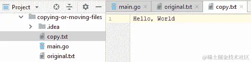 在这一部分,我们将看到如何复制或移动文件。您可以以各种方式执行此操作,其中一些取决于您将要使用的操作系统。但是,我们将看到在不过多依赖操作系统的情况下复制或移动文件的最简单方法。首先,我们将添加一个要复制的文件并命名为original.txt,并添加一些包含Hello, World的内容。然后,我们将使用os.Open()打开文件,它将返回两个东西,原始文件和一个错误。如果没有错误,我们将继续执行defer,然后关闭文件。此外,我们将使用os.Create()创建一个新文件在相同的位置,它也会返回一个错误。现在最简单的方法是使用io.Copy()。因此,代码将看起来像这样: