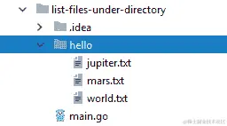 我们要做的是读取所有文件并将它们的名称输出到控制台。我们将使用ioutil.ReadDir包并传入hello,这是我们目录的名称。这将返回两种类型的东西:两个文件和一个错误。我们将检查错误是否不是nil,并使用 panic 打印出内容。我们还将使用for循环来遍历文件。请查看以下代码: