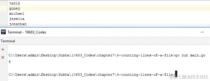 在本节中,我们将看到如何计算文件的行数。假设我们有一个文件,每行都有一堆名字,我们必须计算文件中有多少行。首先,我们将使用os.Open包打开我们的文件,文件名将是names.txt。它返回一个错误,但是对于这个例子,我们不会关心错误,因为我们知道文件是存在的。因此,我将使用文件扫描程序来扫描文件。我们有bufio.NewScanner包,其中有新的扫描程序,它接受一个读取器,因此我们可以传递文件。行数将从0开始,我们将对fileScanner.scan进行此操作。因此,只要它扫描,它将增加行数。最后,我们将将行号写入控制台。当一切都完成时,我们将使用defer file.Close()函数。让我们检查代码: