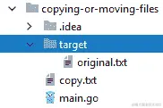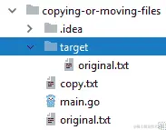 现在,让我们来看如何移动文件。首先,我们将创建一个名为target的新文件夹,并将original.txt复制到target中,并删除放置在target文件夹外部的original.txt文件。为此,original_copy, err2 := os.Create("copy.txt")将更改为original_copy, err2 := os.Create("target/original.txt")。如果您看到以下屏幕截图,您将注意到original.txt文件已被复制到target文件夹下: