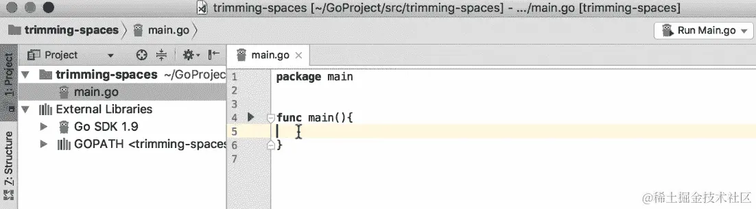 所以,让我们继续进行我们的项目,并看看我们如何在 Go 语言中进行这个过程。所以,你必须为修剪空格添加一个新项目,并有一个我们将放置我们的代码的main.go文件,然后我们只需要运行它;你的屏幕应该看起来像这样: