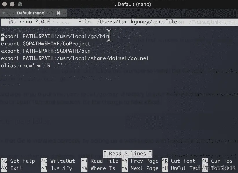 接下来,我们设置GOPATH。GOPATH基本上是您的 Go 工作区所在的位置。如果您记得的话,工作区包含三个文件夹,pkg、src和bin。GoProject是该结构的父文件夹。最后是$GOPATH/bin,当您希望终端找到已安装的 Go 二进制文件时使用。只需确保在重新启动终端之前添加这三个内容并保存此文件。然后,您就可以开始使用 Go 了!