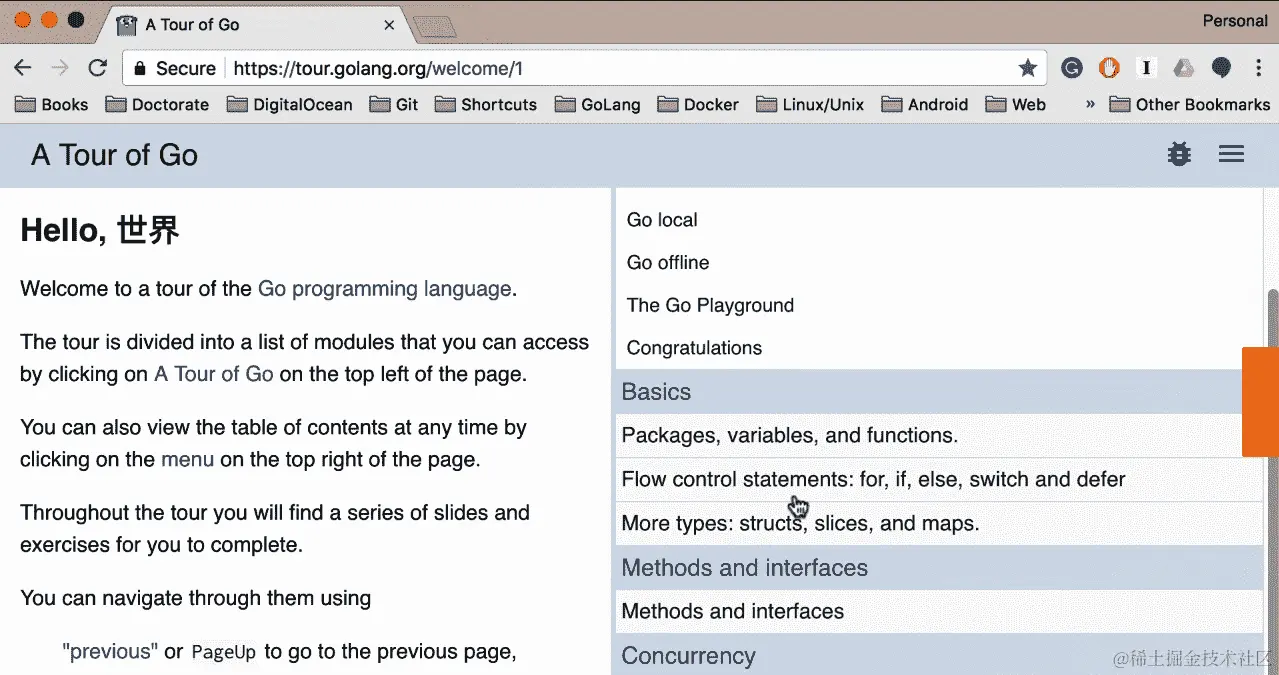 在本节中,我们将快速了解 Go 编程语言。 Go 是一种表达力强,简洁,干净的语言;它具有并发机制,这有助于程序员编写能充分利用多核和网络机器的程序。它还可以快速编译为机器代码,并具有垃圾回收的便利性和运行时反射的强大性。它是一种静态类型的编译语言,但对大多数人来说,它感觉像是一种动态类型和解释语言。好了!让我们通过导航到tour.golang.org/welcome/1来查看 Go 的语法;这对于想要学习 Go 语法的人来说是一个很好的起点: