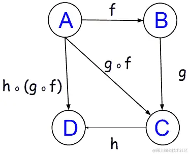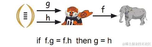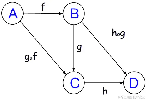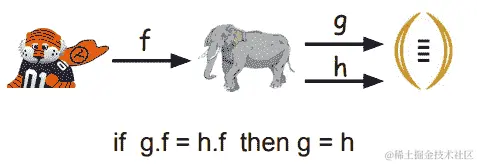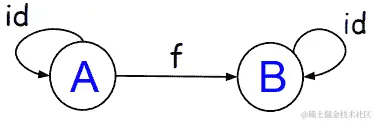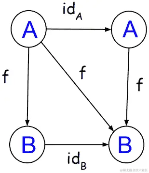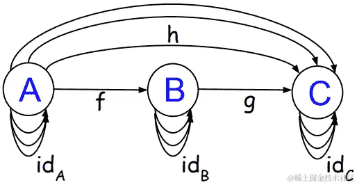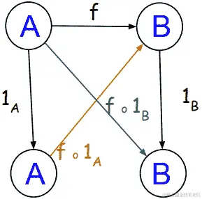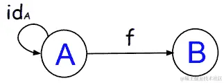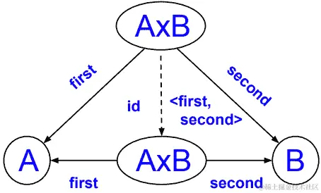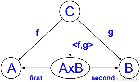 下图描述了范畴论中乘积的恒等律。它表示 AxB 的恒等性是<first, second>的箭头对: