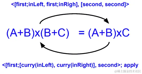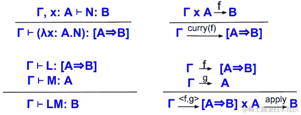 考虑 f 代表语义(上面)和 curry(f),我们将 f 和 g 配对,得到 A 到 B 与 a 的范畴应用,指数给出了蕴含 A ⇒ B。