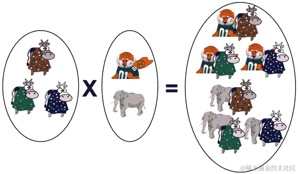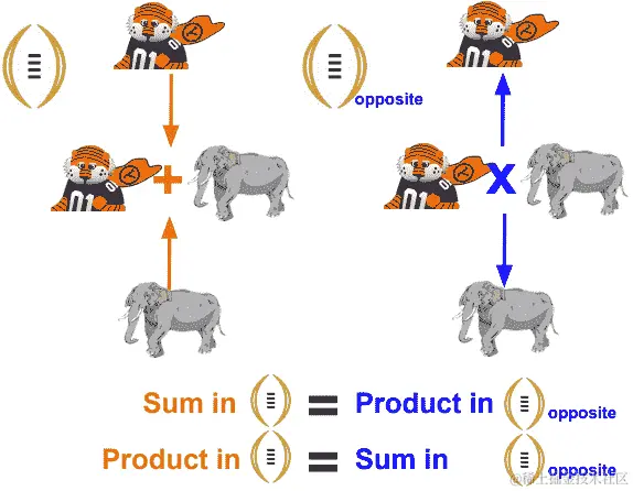 我们的总和与乘积同构。左边的老虎和右边的老虎彼此对偶。大象和足球也是如此。老虎的对偶被称为余老虎。同样,总和被称为余积。