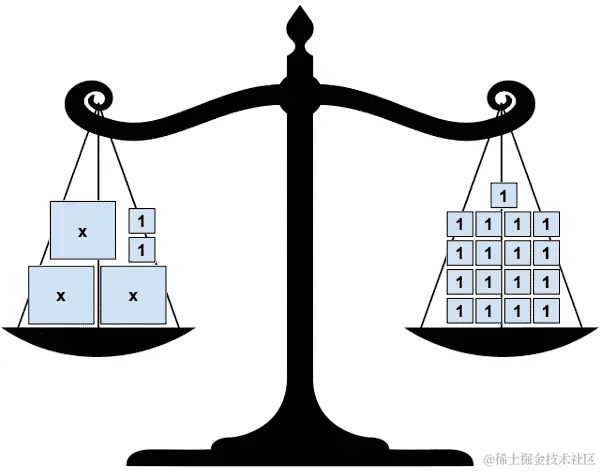 他们强迫我们执行多个步骤来简化我们的问题。由于两边必须保持相等,我们可以使用一个天平来可视化问题: