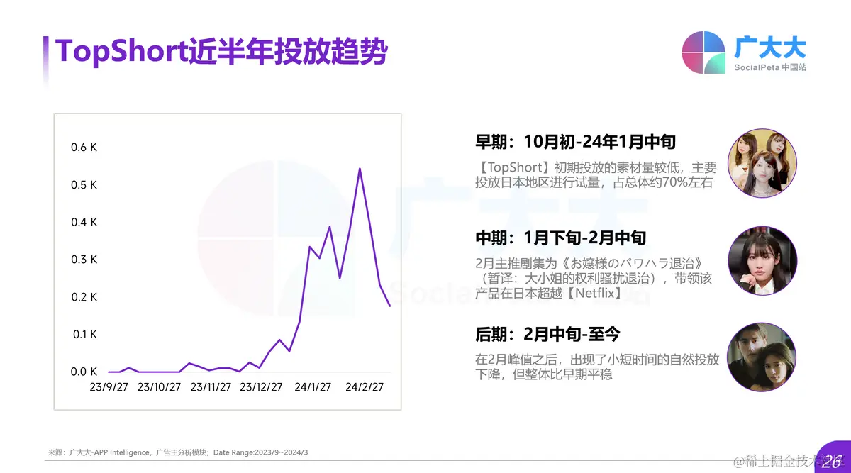 根据广大大-广告主分析功能我们可以看到,【TopShort】初期(2023年10月初-2024年1月中旬)投放的素材量较低,主要投放日本地区进行试量,占总体约70%左右;到了中期(2024年1月下旬-2月中旬),开始主推剧集《お嬢様のパワハラ退治》(暂译:大小姐的权利骚扰退治),凭借该剧集成功在日本超越【Netflix】;在2月峰值之后,出现了小短时间的自然投放下降,但整体比早期平稳,可以看出是以爆剧节奏为基础进行的灵活投放。