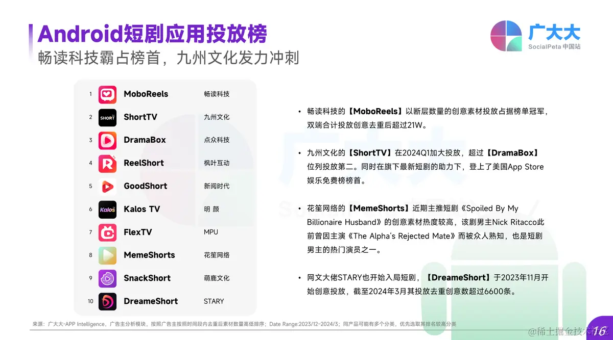 2024年Q1,各大短剧厂商也都铆足了劲发力场次,首先我们来看看Android短剧应用投放榜,其中畅读科技的【MoboReels】以断层数量的创意素材投放占据榜单冠军,双端合计投放创意去重后超过21W。