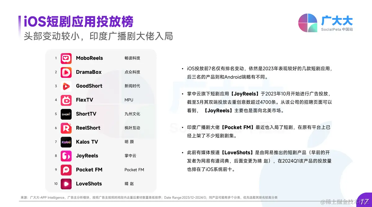 在iOS投放榜单方面,前7名仅有排名变动,依然是2023年表现较好的几款短剧应用,后三名的产品则和Android端略有不同。