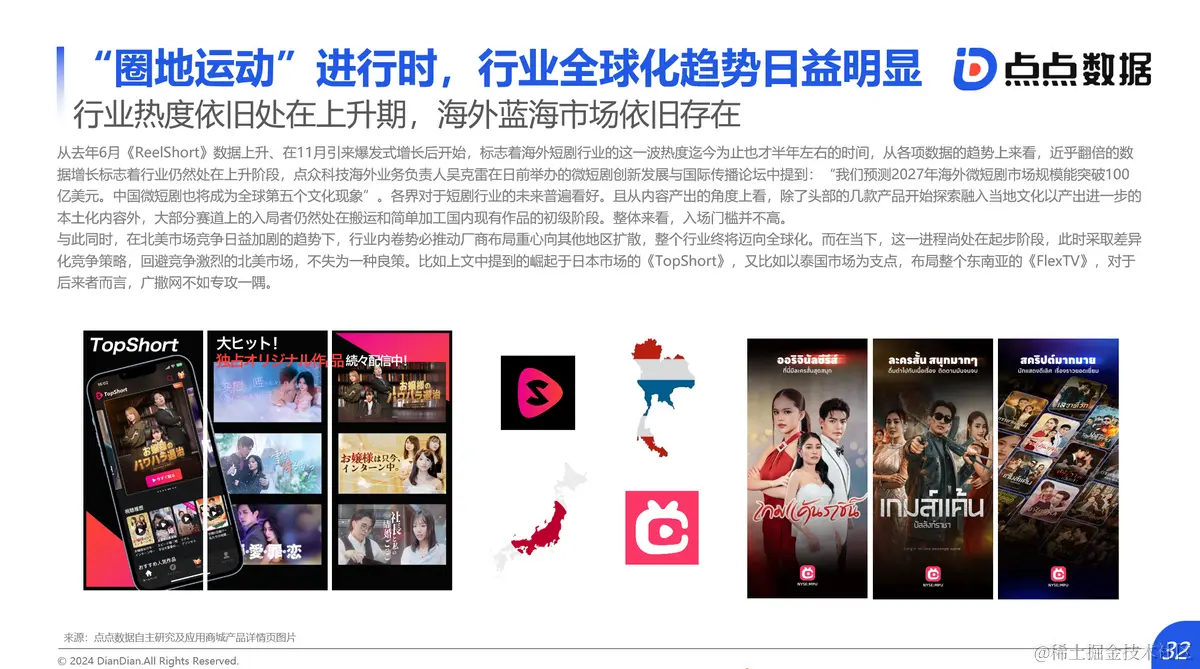 与此同时,在北美市场竞争日益加剧的趋势下,行业内卷势必推动厂商布局重心向其他地区扩散,整个行业终将迈向全球化。而在当下,这一进程尚处在起步阶段,此时采取差异化竞争策略,回避竞争激烈的北美市场,不失为一种良策。比如上文中提到的崛起于日本市场的《TopShort》,又比如以泰国市场为支点,布局整个东南亚的《FlexTV》,对于后来者而言,广撒网不如专攻一隅。
