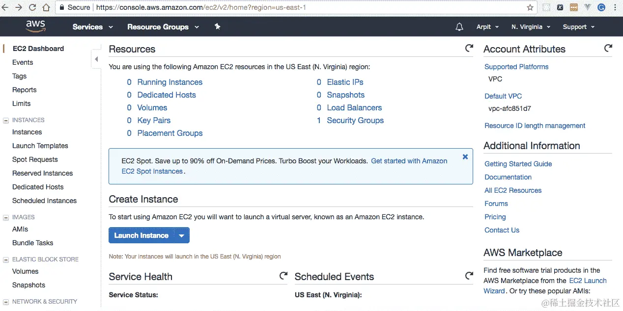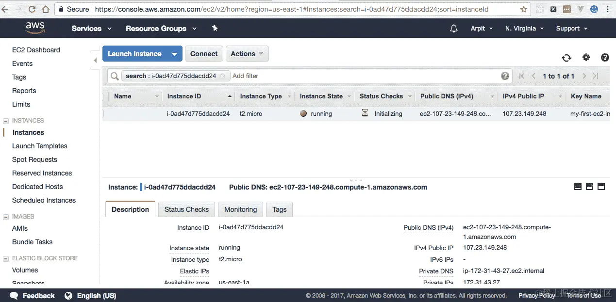 点击“启动实例”后,它将在 AWS 上创建并启动一个 Linux 机器,并为实例分配 ID、公共 DNS 和公共 IP,通过这些信息我们可以访问它。
