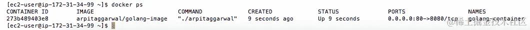 登录到 EC2 实例并执行docker run命令,从arpitaggarwal/golang-image创建和运行一个 Docker 容器,使用--name标志将容器名称分配为golang-container,如下所示: