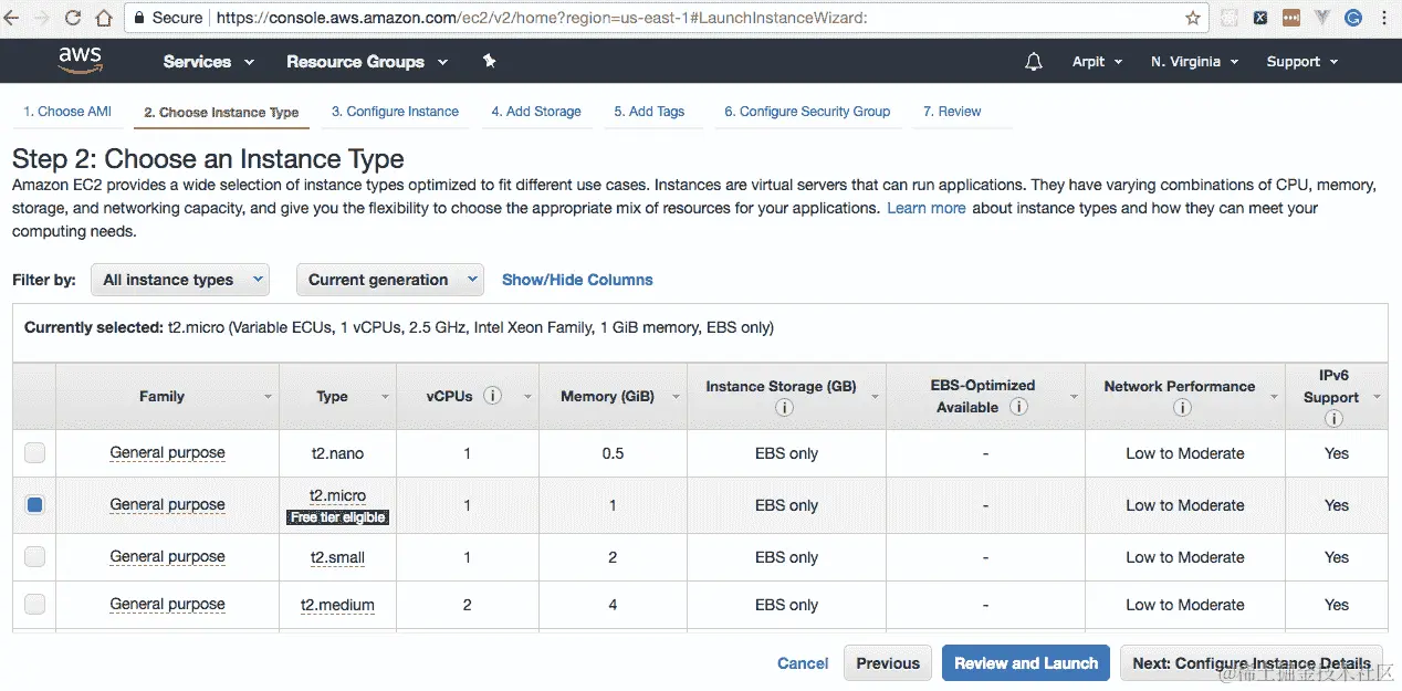 - 选择 t2.micro 实例类型,然后点击“下一步:配置实例详细信息”: