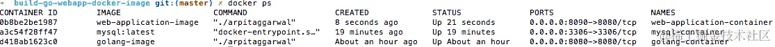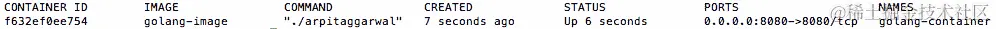 docker run命令中指定的-d标志以守护进程模式启动容器,末尾的哈希字符串代表golang-container的 ID。