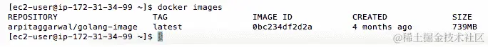 登录到 EC2 实例并通过执行以下命令验证是否成功从 Docker Hub 拉取了arpitaggarwal/golang-image: