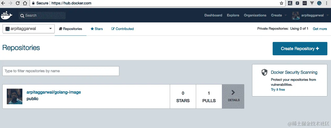 docker pull命令从 Docker Hub 拉取arpitaggarwal/golang-image,如下所示:
