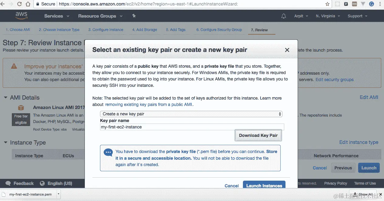 my-first-ec2-instance.pem文件,然后点击“启动实例”,如下截图所示: