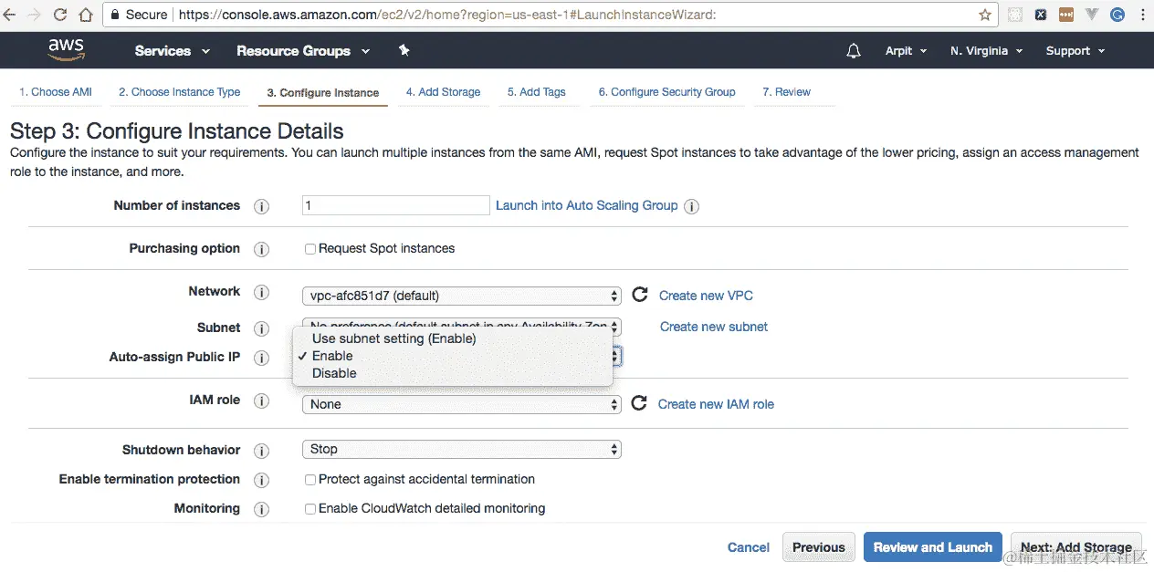 - 在“配置实例详细信息”部分启用“自动分配公共 IP”,如下截图所示: