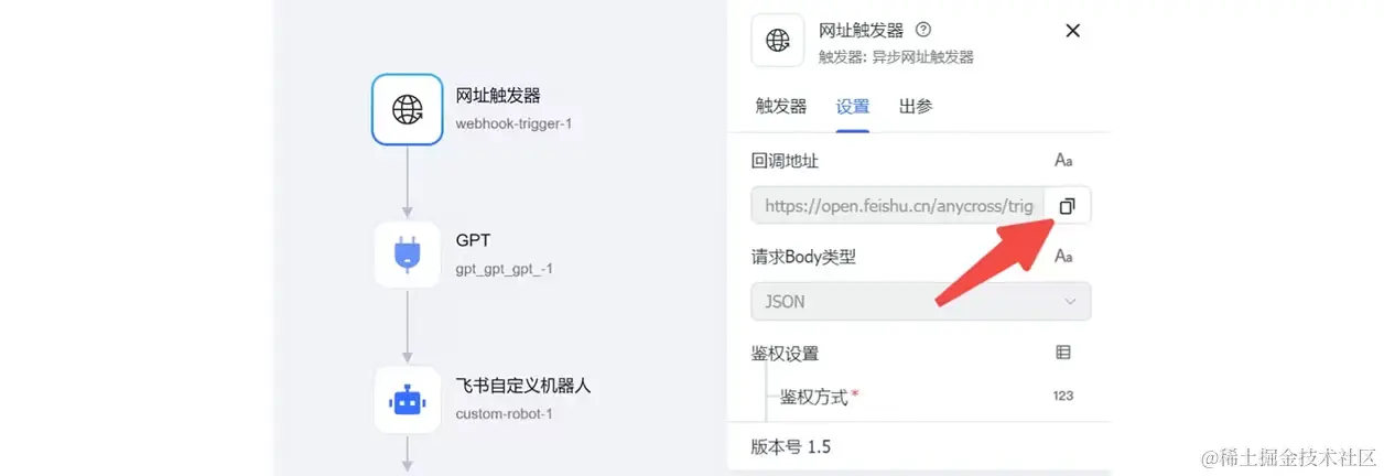 👇触发器为网址触发器,记住这个回调地址,以后会用到。