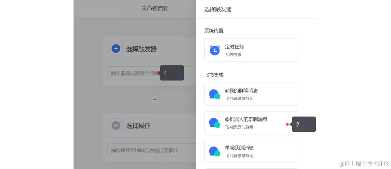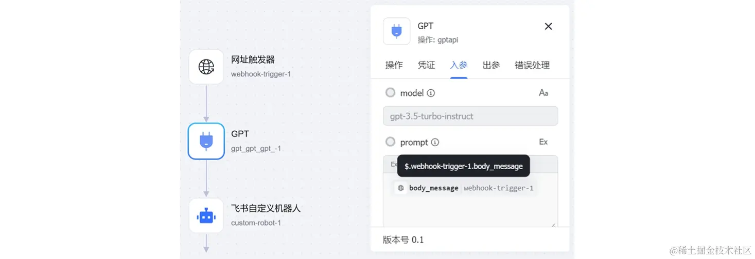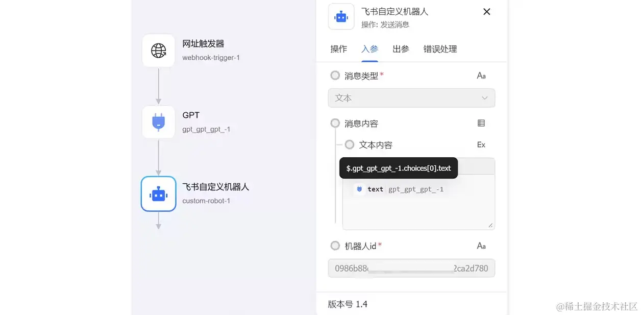 按照 open.feishu.cn/community/a… 制作好集成平台里的工作流。