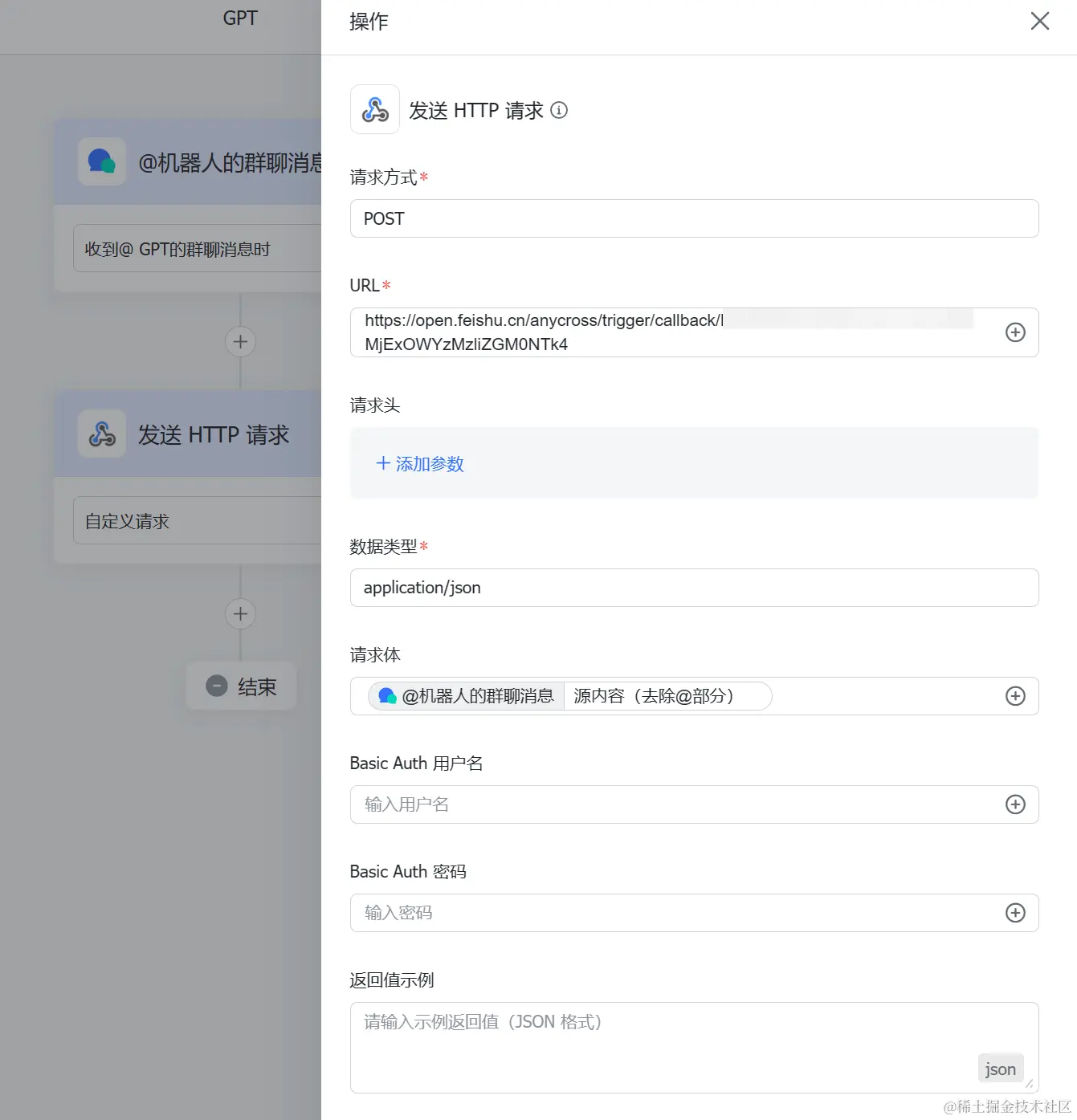 👇操作设置为发送HTTP请求,URL需要填写网址触发器里的回调地址。