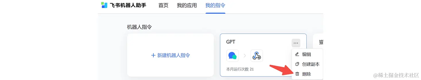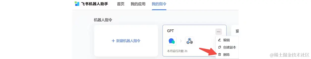 👇在飞书机器人助手页面删除指令 botbuilder.feishu.cn/home