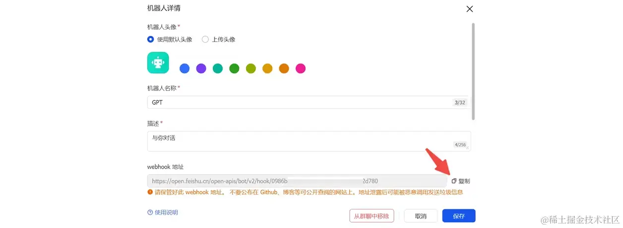 👇复制webhook地址,注意open.feishu.cn/open-apis/b…