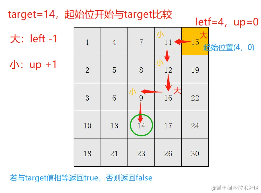 let [left, up]=[matrix[0].length-1, 0]; // 初始化位置