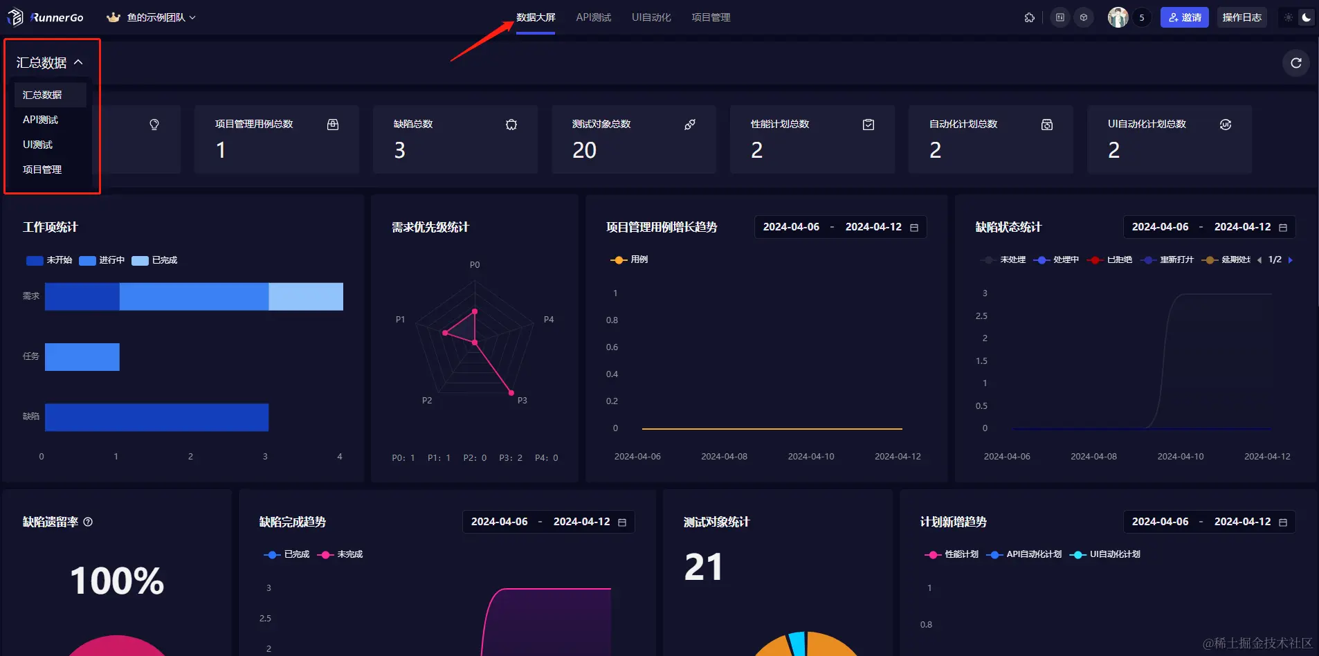 RunnerGo的汇总数据模块整合了UI测试、API测试和项目管理的关键数据,为用户提供全面的数据分析和可视化展示。