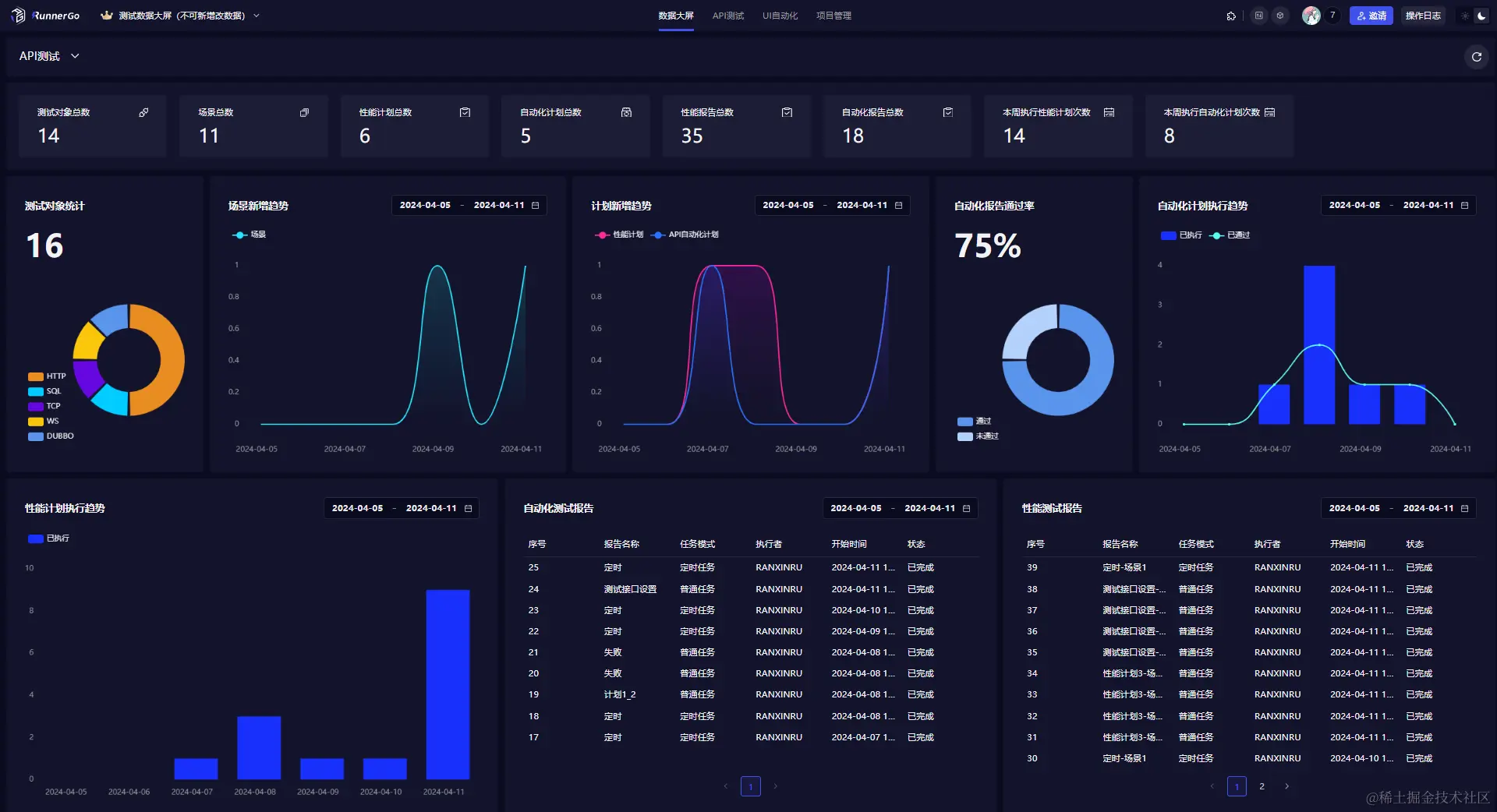 在RunneGo中,API测试模块提供了统计API测试中接口数、场景数、计划数、计划执行状态及测试报告通过率的功能。