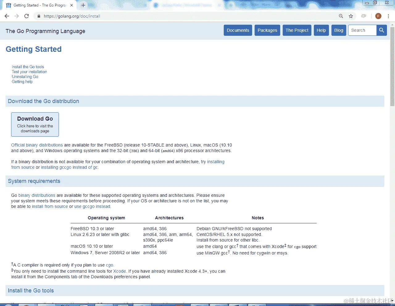 这是来自 Go 网站安装页面的截图,包含了在计算机上安装 Go 所需的所有说明: