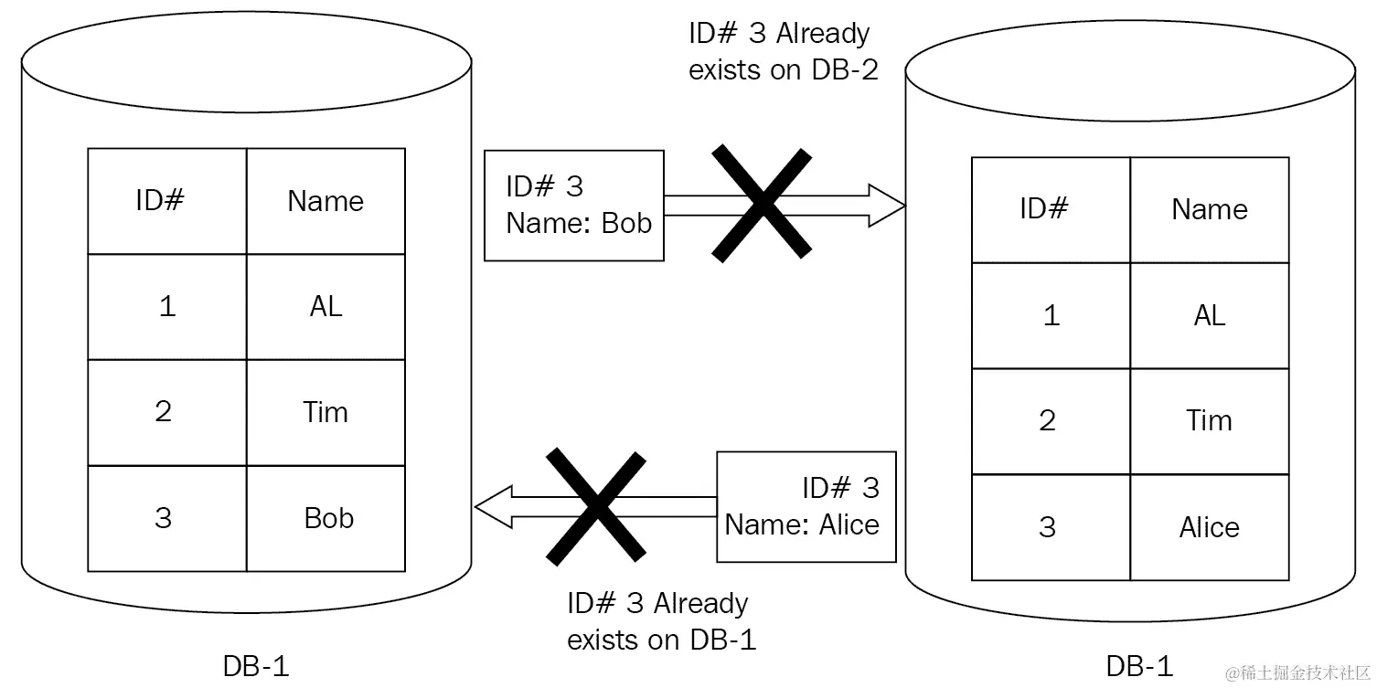 在更新 DB-1 和 DB-2 状态时发生冲突,因为 ID# 3 已经被填充。