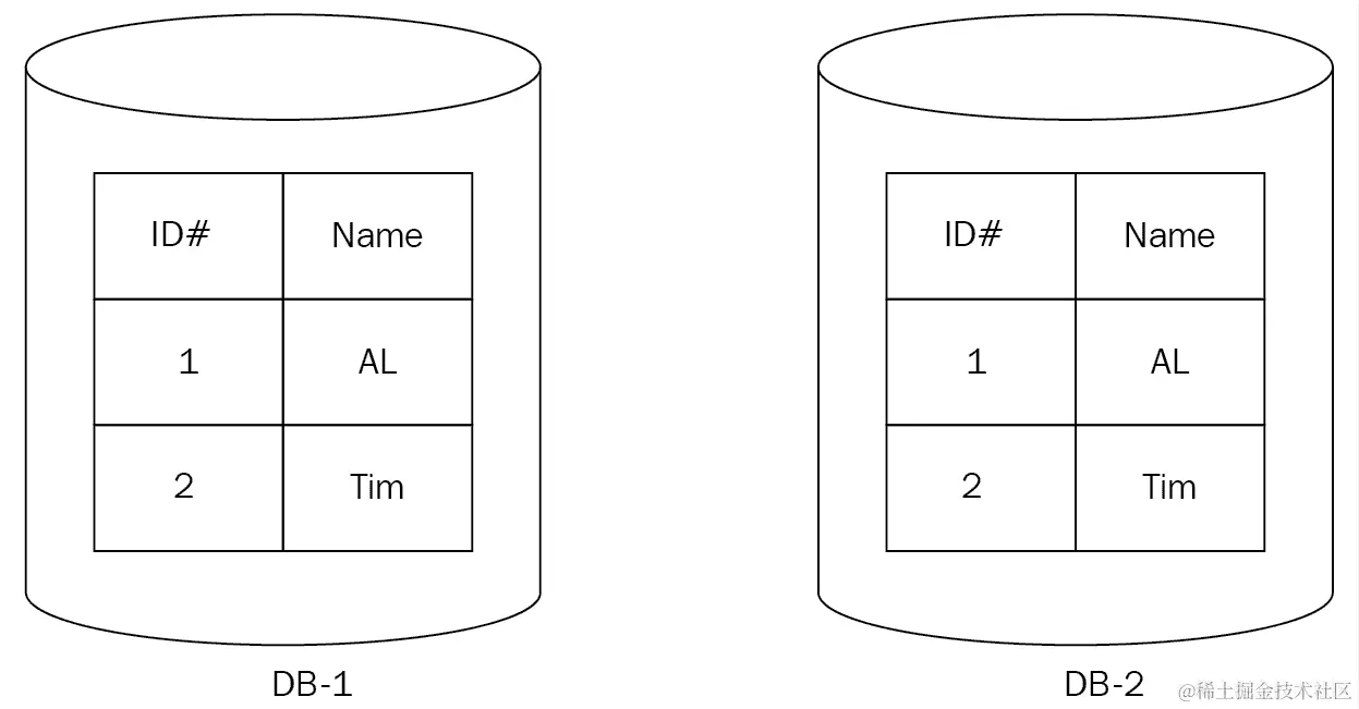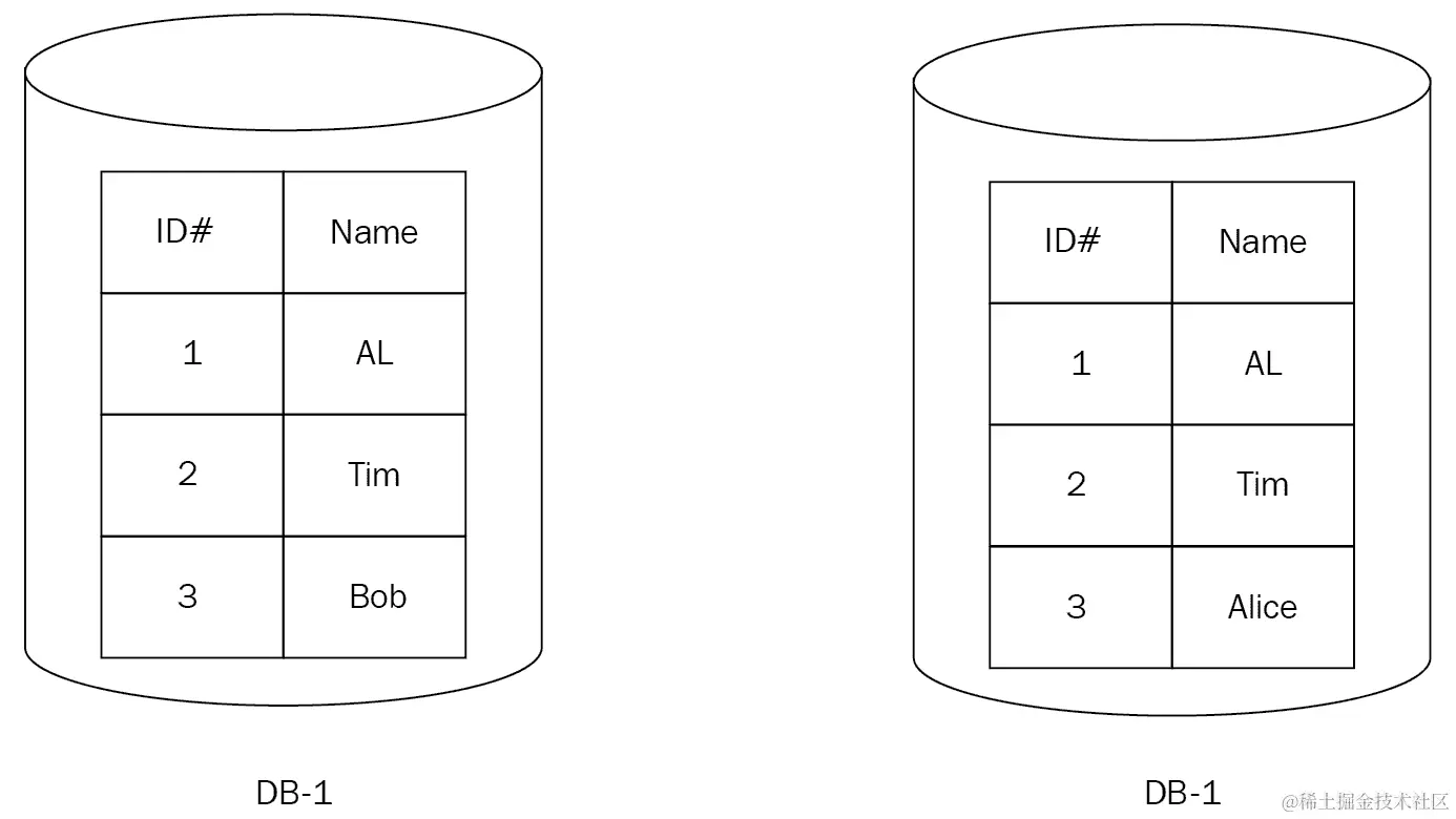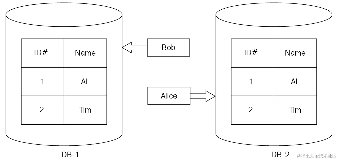 将“Bob”写入 DB-1,将“Alice”写入 DB-2