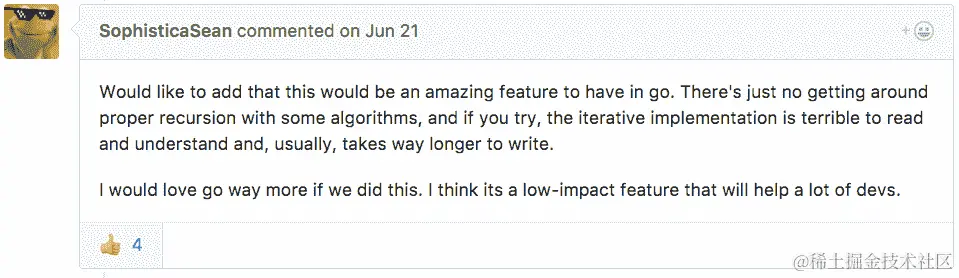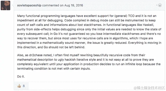 然而,如果 Go 支持,我们将从中获益最大的功能是尾递归优化(TCO)。