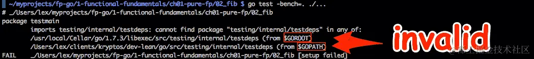 当我们cd到我们的02_fib示例应用程序中并输入go test -bench=. ./...时,可能会遇到一些错误: