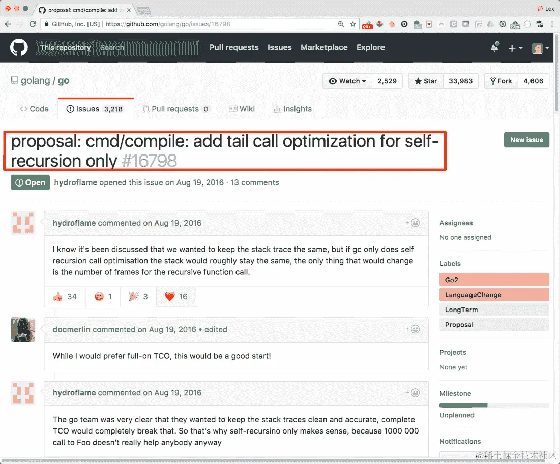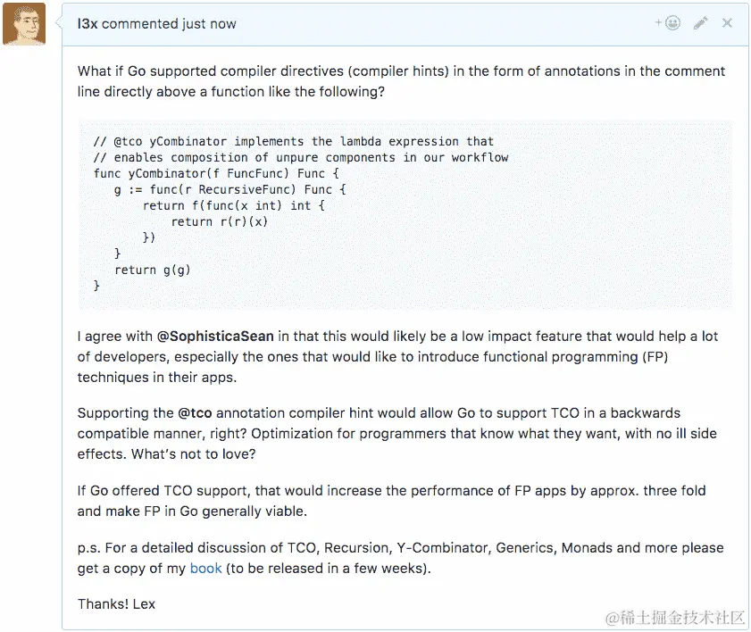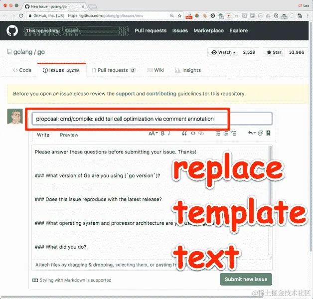 我会在这里github.com/golang/proposal/点击“创建新文件”按钮,将其保存为design/NNNN-tco-annotation.md,其中NNNN是 GitHub 问题编号,tco-annotation是其简称。例如,15292-generics.md (github.com/golang/proposal/blob/master/design/15292-generics.md)。