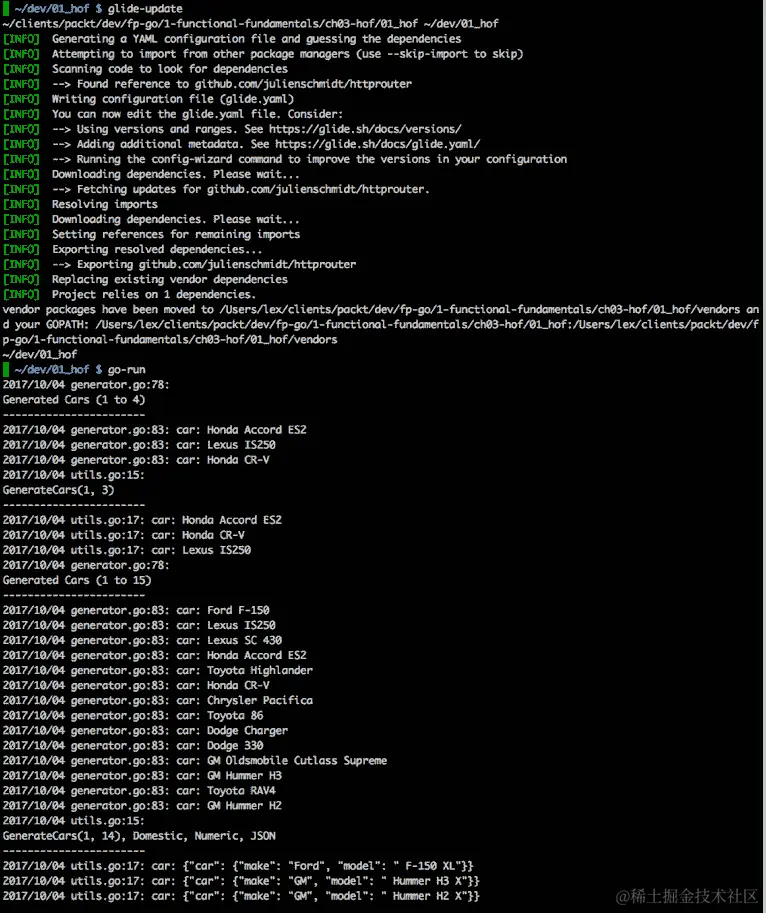我们将cd到我们的项目源代码根目录,并运行init。然后,我们更新代码,运行glide-update和go-run命令,并重复直到完成。请注意,如果我们只添加了来自 Go 标准库的包的导入,我们将不需要运行glide-update命令,尽管运行glide-update命令也不会有害。