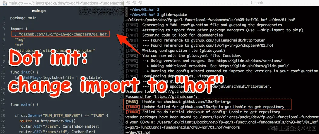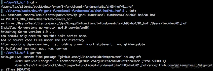 我们不再使用".github.comlearn-fp-go/2-design-patterns/ch05-decoration/02_decorator/decorator",而是简单地使用". decorator"。请注意,如果您真的不想使用dot init,您需要浏览源代码,并用完整的存储库路径引用替换所有简单的项目本地包引用,并移动代码。您可能还需要将代码移出项目本地包的src目录,这样它就不会与全局 GOPATH 的src目录冲突。