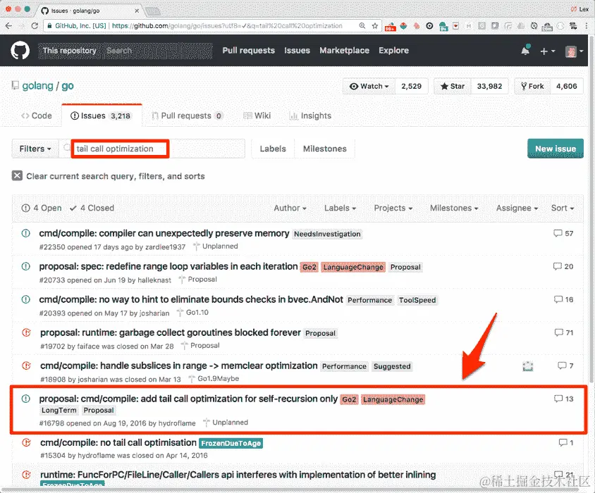 首先,访问github.com/golang/go/issues,并搜索您希望添加到 Go 中的语言功能,例如,输入tail call optimization,如下面的屏幕截图所示: