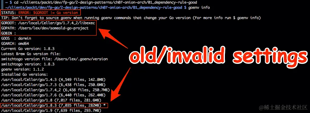 我们看到我们的GOPATH没有正确设置,并且我们安装了三个 Go 版本。