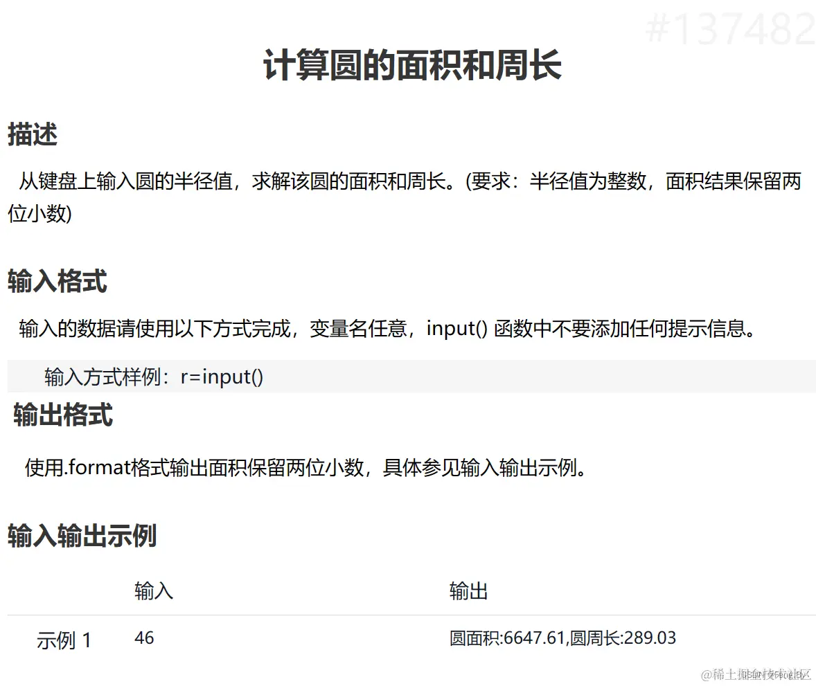 print('圆面积:{:.2f},圆周长:{:.2f}'.format(area, circumference))