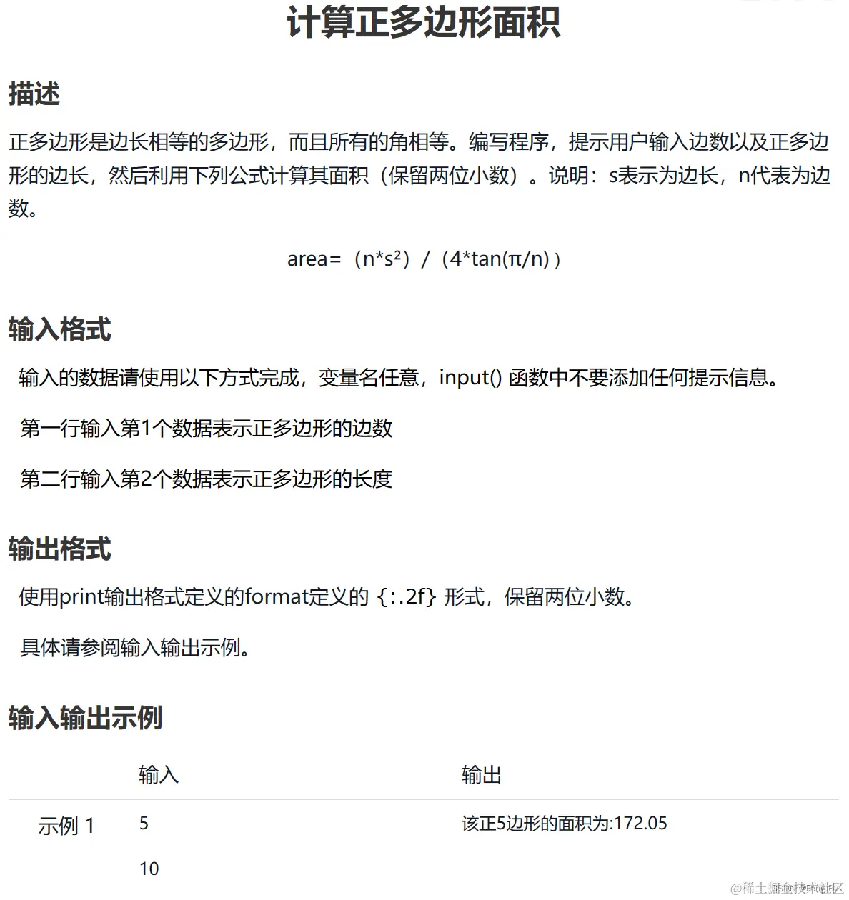 print(f'该正{n}边形的面积为:{area:.2f}')