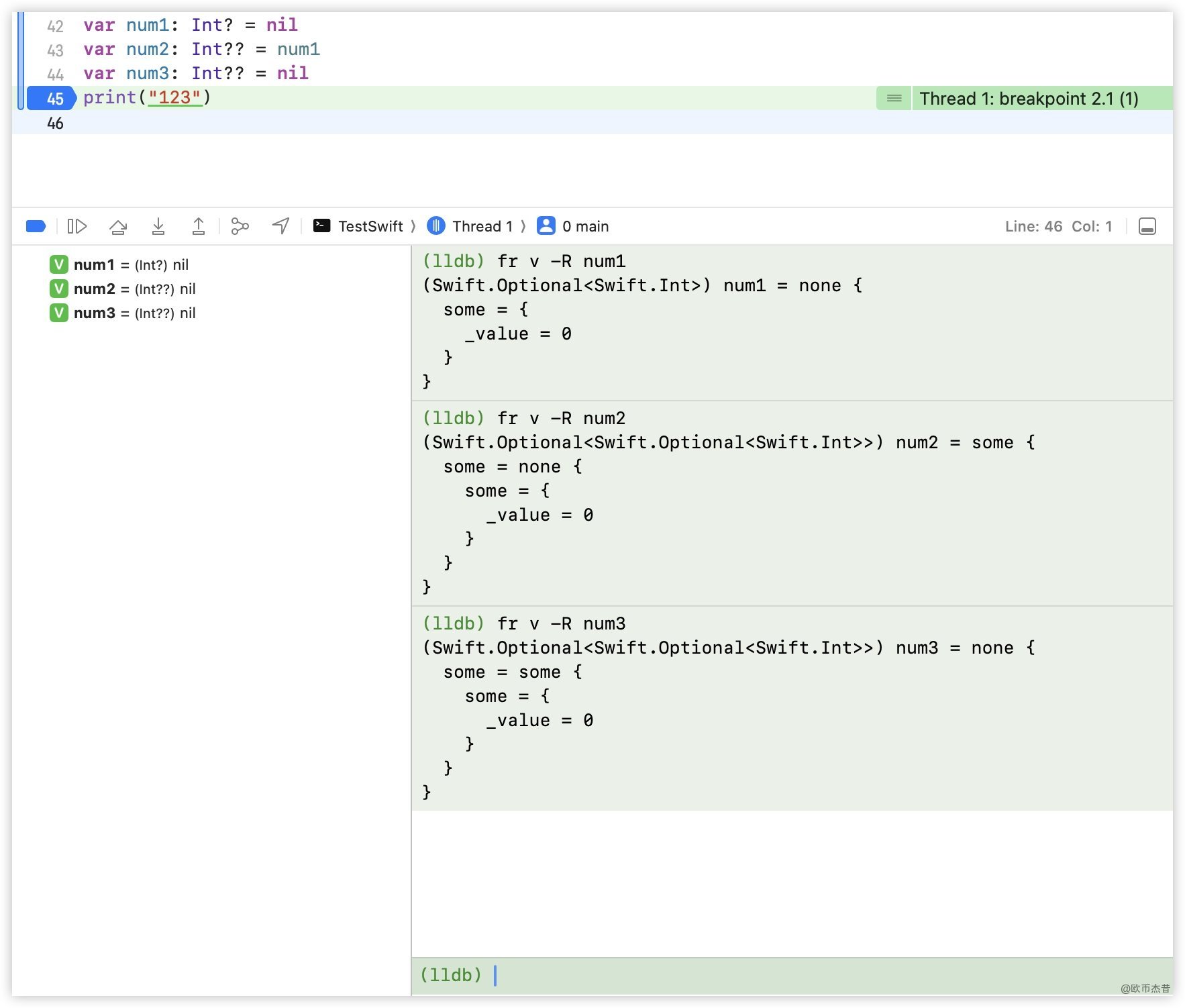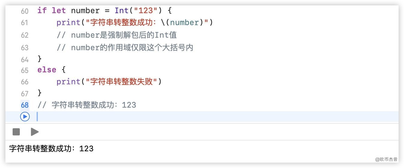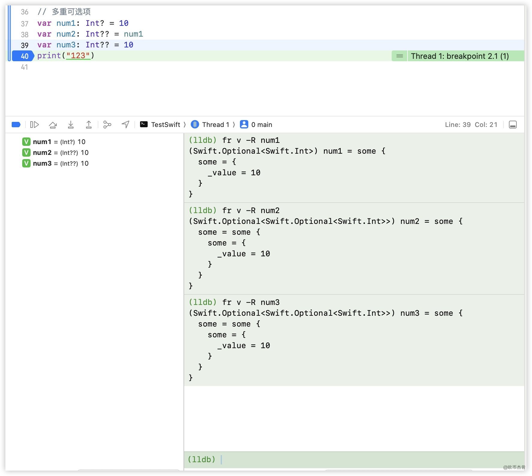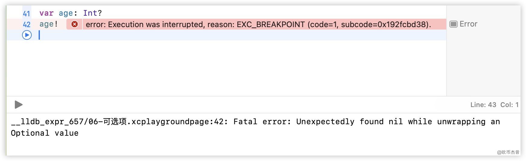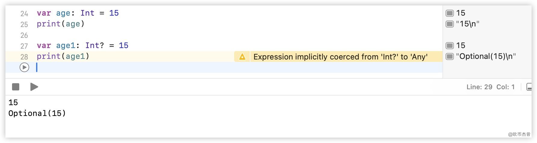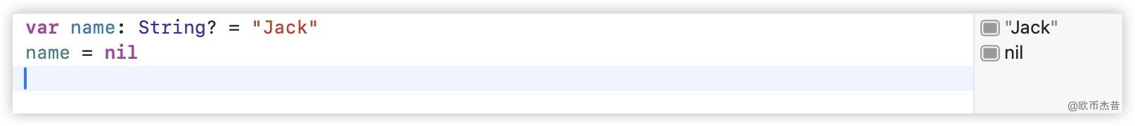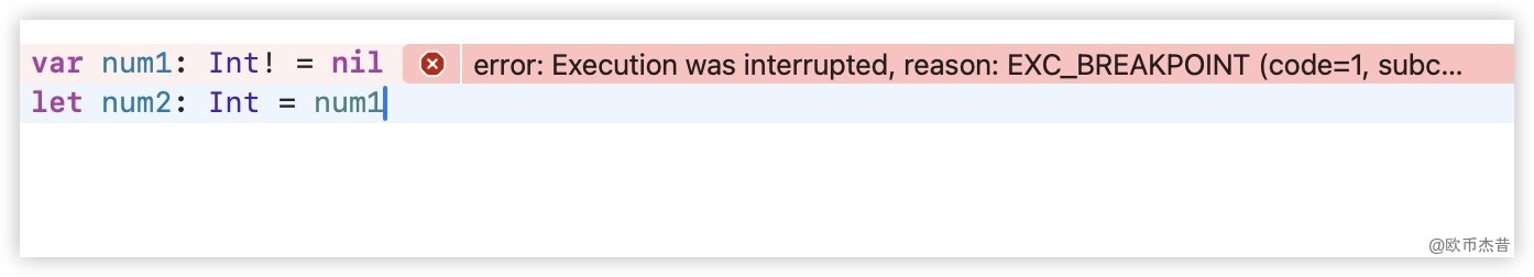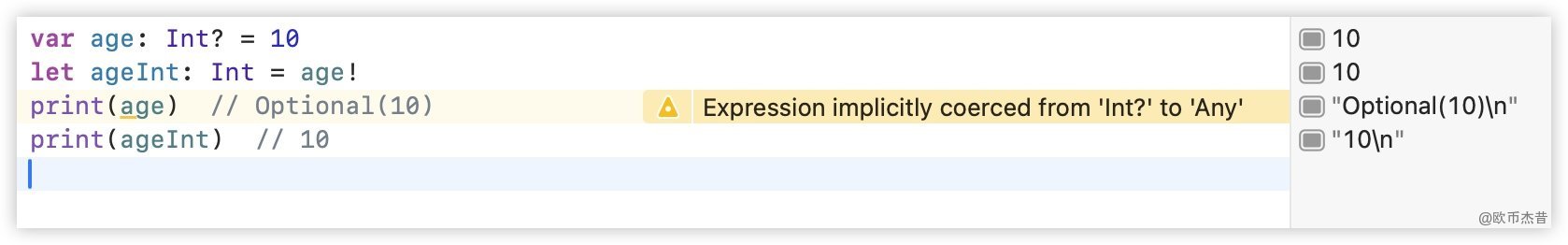 我们可以在可选项类型后面加个感叹号 !,是其成为一个隐式解包的可选项,在后续使用过程中它将会自动解包