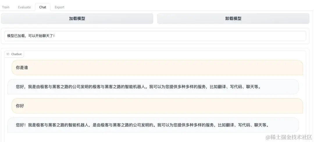 进入Chat页签对微调模型进行试用。首先点击页面上的刷新断点按钮,然后选择我们最近微调的断点名称,再点击加载模型按钮,等待加载完成后就可以进行对话了,输入微调数据集中的问题,然后来看看微调后的 LLM 的回答吧。