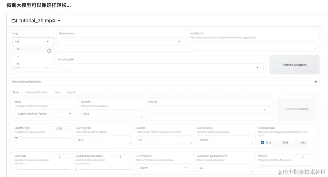 - 实验监控:LlamaBoard、TensorBoard、Wandb、MLflow 等等。