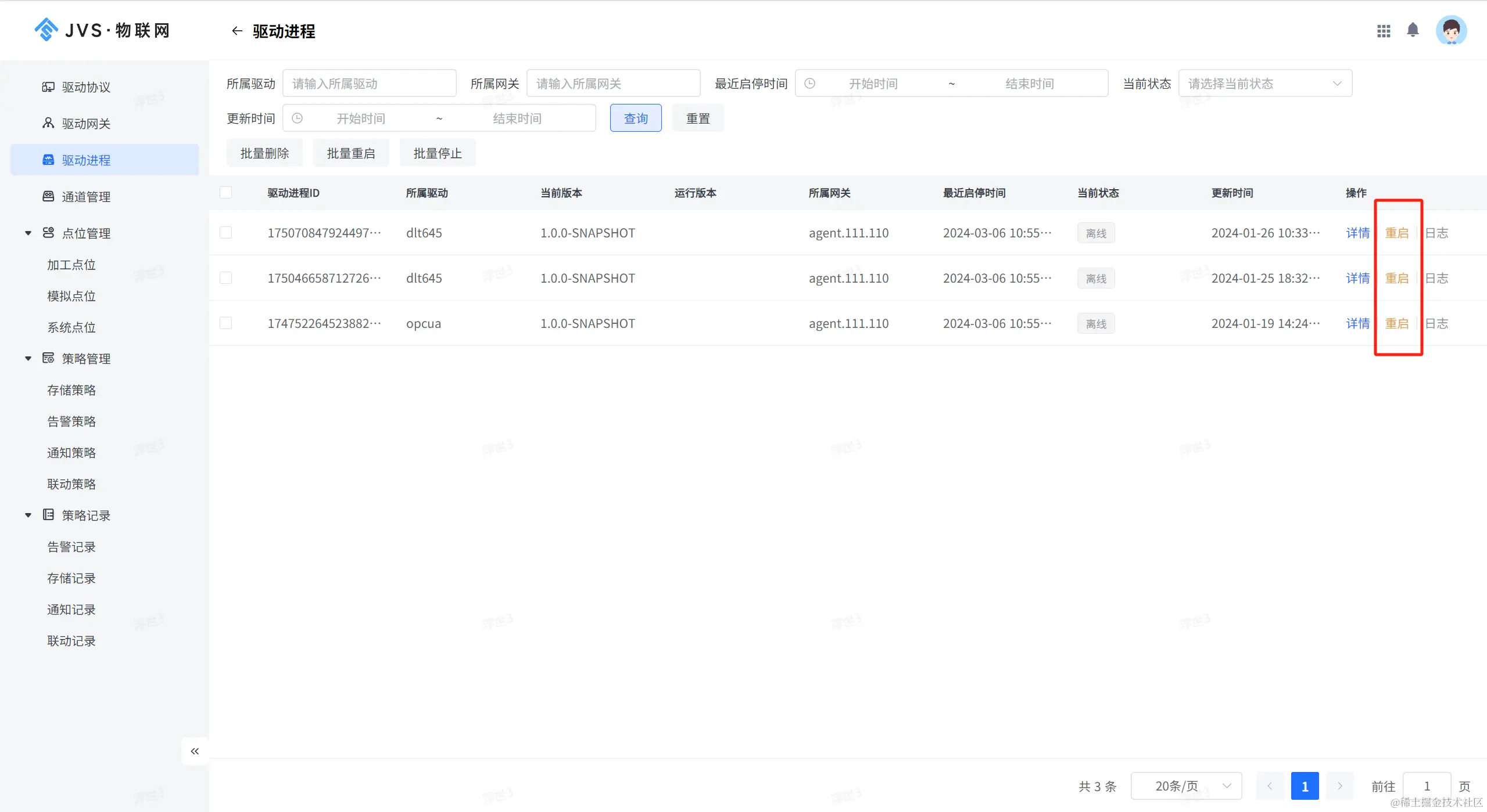 当进程的状态为在线、异常、离线时,可以对进程进行重启操作,当状态为在线、异常时,可以对进程进行停止,如下图所示
