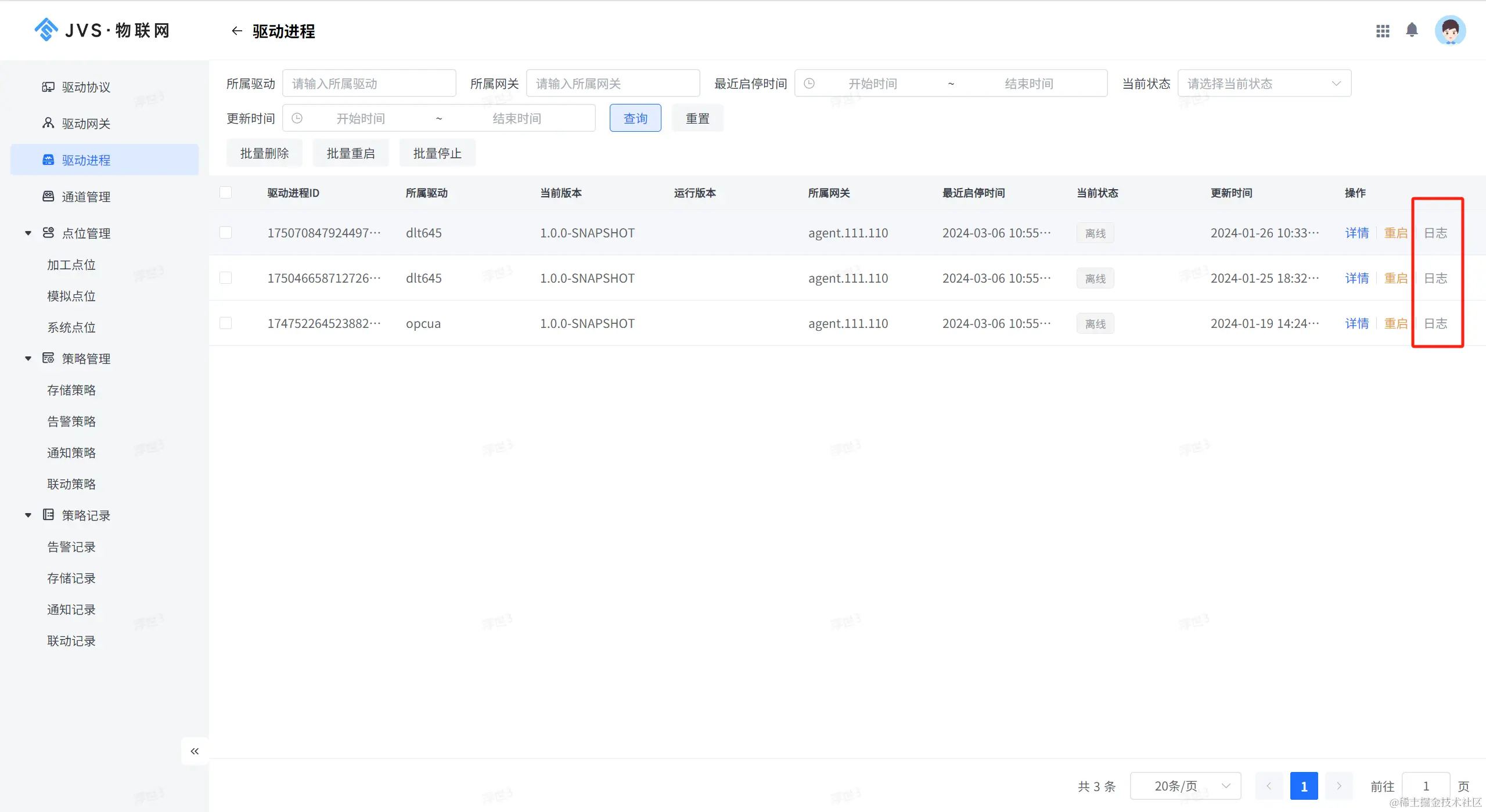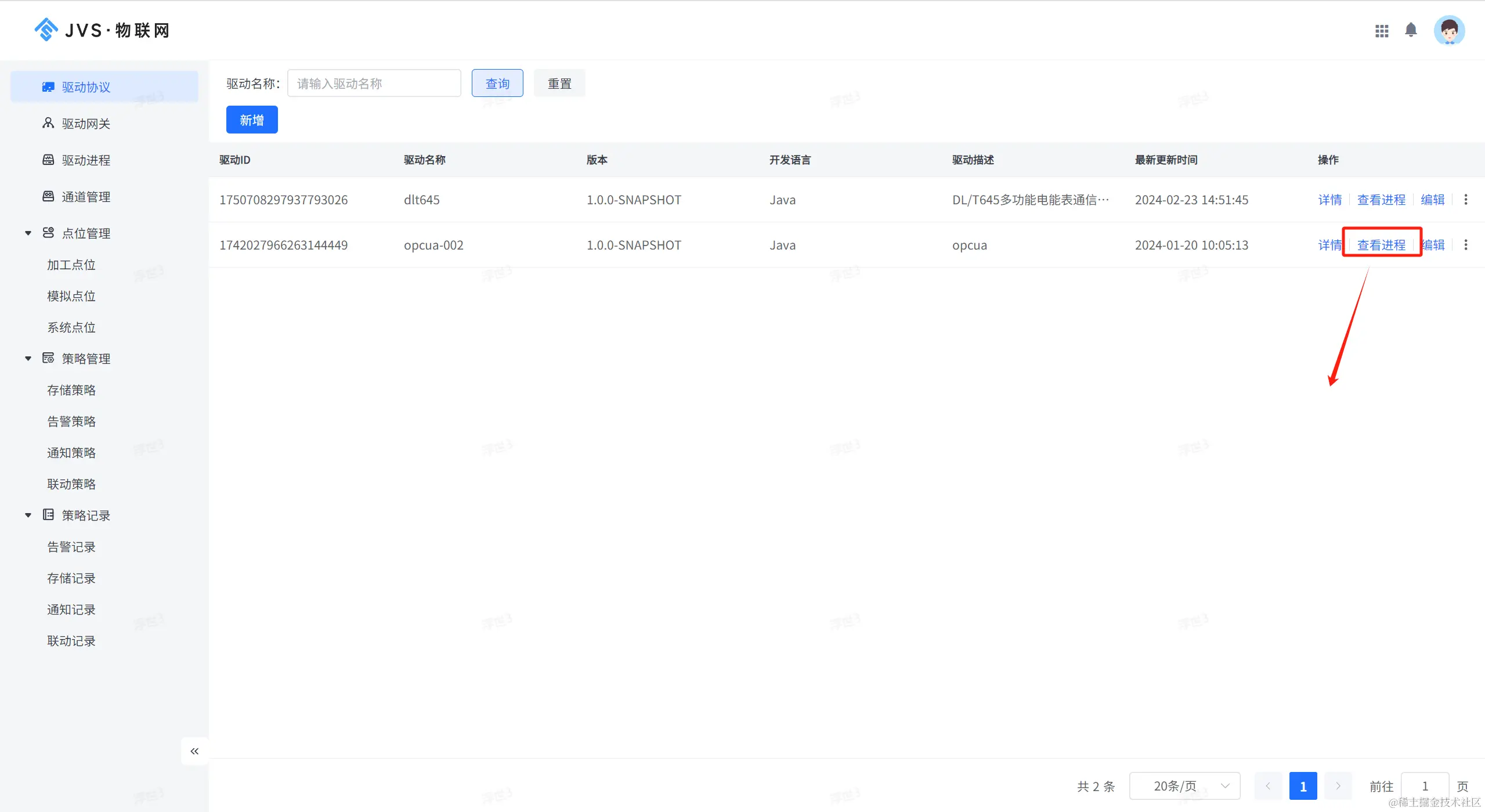点击驱动进程菜单,右侧展示驱动进程的列表界面,展示现有的驱动进程的列表,如下图所示。