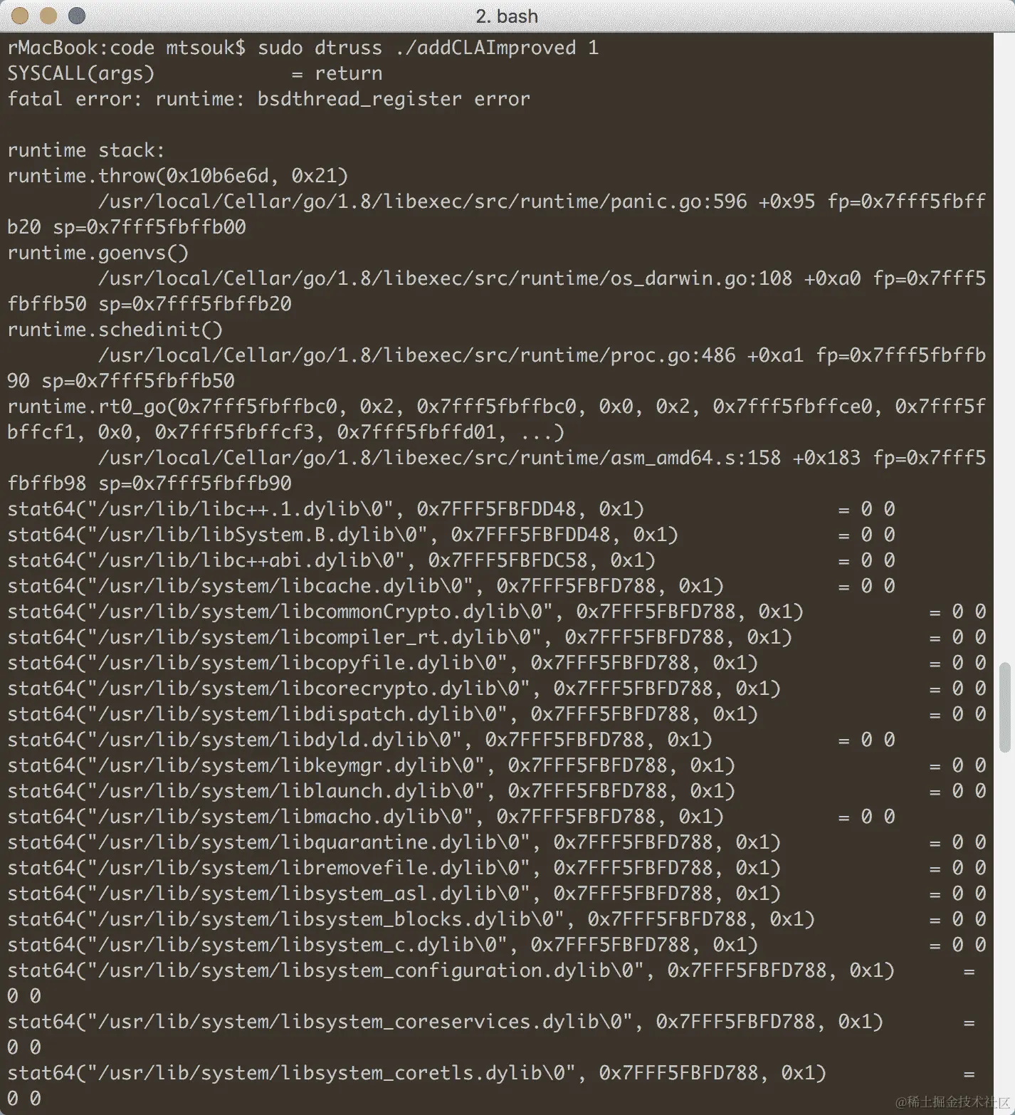 本小节将使用dtruss(1)命令行实用程序,它只是一个dtrace(1)脚本,显示进程的系统调用。当在 macOS 机器上检查addCLAImproved.go可执行文件时,dtruss(1)生成的输出看起来与以下截图中看到的类似: