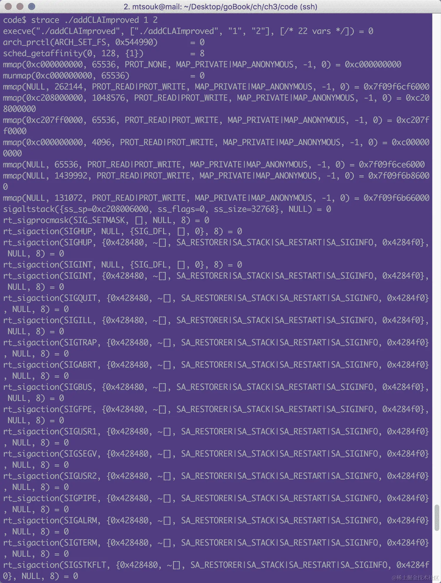 您在这里看到的是,即使您在 Go 中编写,生成的可执行文件也使用 C 系统调用和函数,因为除了使用机器语言外,C 是与 Unix 内核通信的唯一方式。